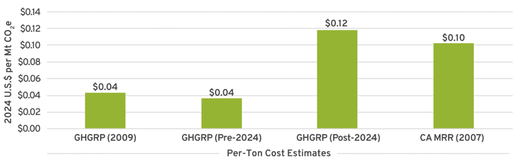 Figure 1 details the cost of GHG reporting on a per-ton basis for four estimates: The initially estimated cost of the GHGRP in 2009, the estimated cost of the GHGRP before the 2024 modifications, the estimated cost of the GHGRP after the 2024 modifications, and the estimated cost of the MRR in 2007.