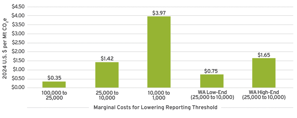 In Washington, where the state reporting program functionally lowers the threshold from the federal requirement of 25,000 Mt CO2e to 10,000 Mt CO2e per year, the marginal cost to report new emissions is between $0.75 and $1.65 per metric ton.