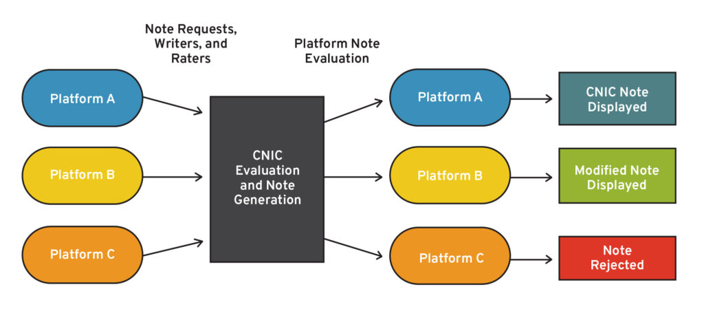 Such a process would permit the CNIC to leverage requests, writers, and raters from multiple platforms while allowing each platform to maintain full control over the result. This interoperability would allow notes to be identified, created, and shared seamlessly across participating platforms, which would significantly accelerate the spread of accurate information and contextual understanding to counter misinformation in real time.