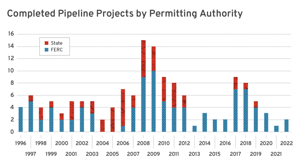 However, when examining completed pipeline projects broken down by permitting authority, we see that few major natural gas pipeline projects have been completed in recent years. Importantly, although states used to approve a relatively large share of natural gas pipeline, most recent projects have fallen under the jurisdiction of the Federal Energy Regulatory Commission (FERC).