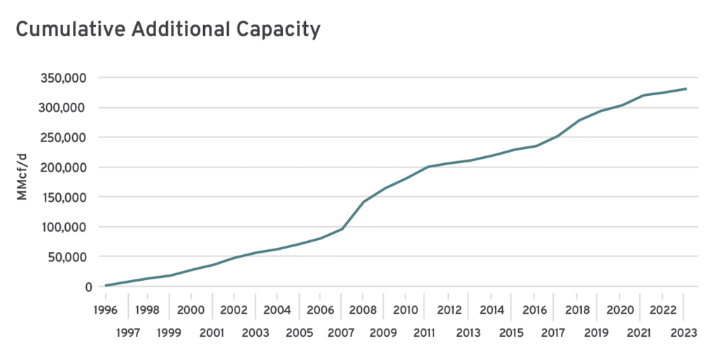 Excluding Texas from the data, we gain even more insight. We can see increases in the cumulative capacity of natural gas pipelines in some states with large increases in natural gas production, like Pennsylvania. Meanwhile, states with policies that restrict pipeline development—such as California, Massachusetts, and New York—have barely approved any new pipelines in recent years.