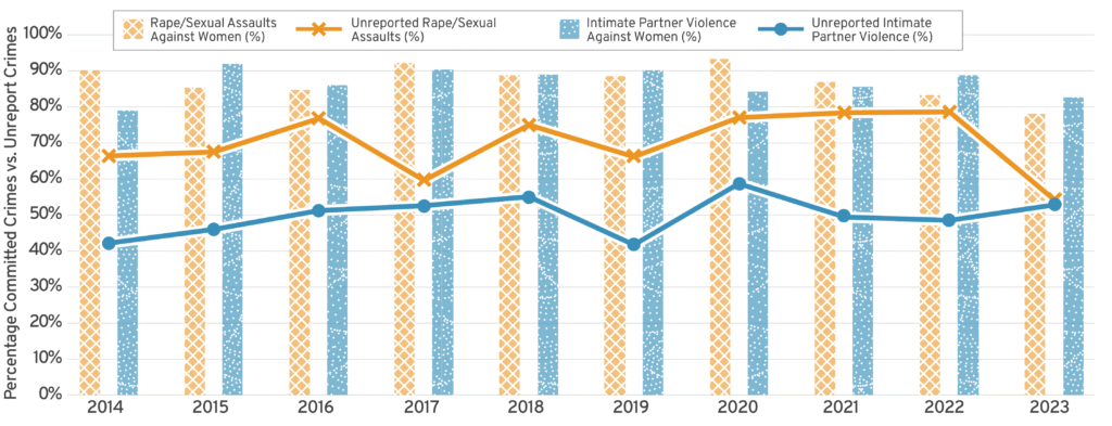 Often, female victims feel that the justice system fails to provide meaningful outcomes, which contributes to rates of underreporting. As Figure 1 shows, approximately one-half of violent crimes and two-thirds of rape cases—in which women are disproportionately victims—go unreported. Victims choose not to report violent crimes for a variety of reasons, including believing police would not be helpful, fearing retaliation, or thinking the offense should be addressed outside of the criminal justice system. Concerns about police response are particularly strong in cases of sexual or domestic violence, where victims often anticipate dismissal or re-traumatization by law enforcement.