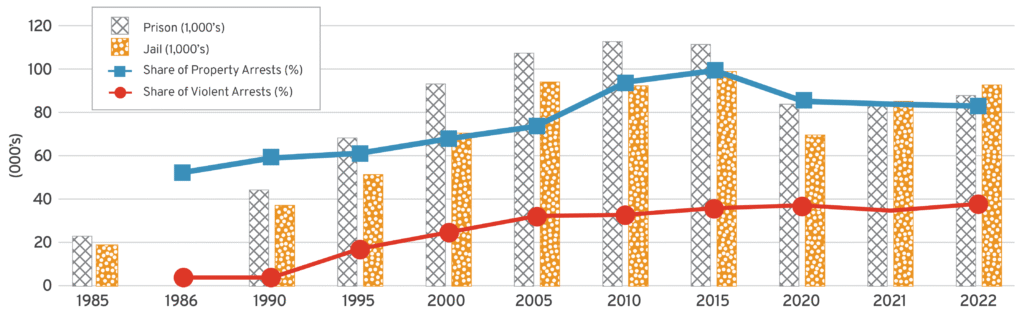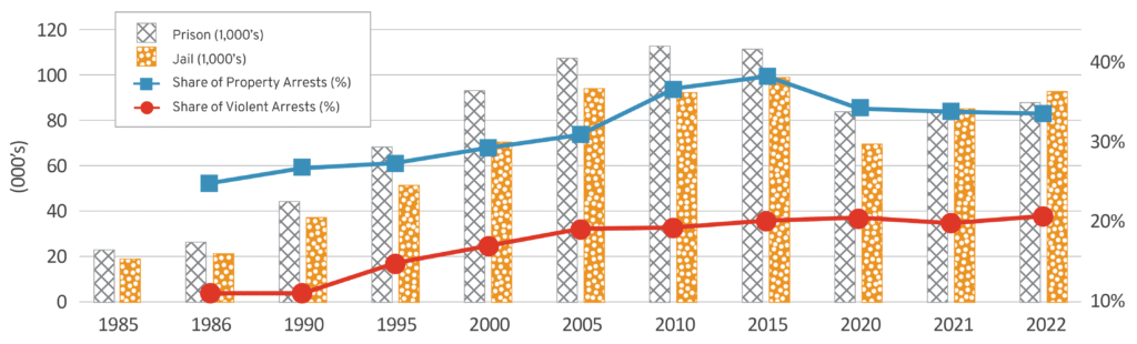 Over the last several decades, women have been the fastest-growing population in the criminal justice system. As shown in Figure 2, the incarcerated female population has tripled since 1985, doubling the growth rate seen among men. Arrest trends mirror this rise. In 2019, female arrest rates for violent crimes were 63 percent higher and for drug crimes 317 percent higher than they were in 1980. By the early 2020s, nearly 1 million women were involved in the criminal justice system.