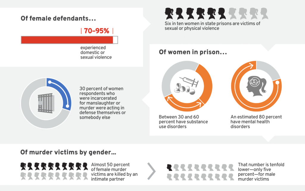 While many women do indeed perpetrate domestic violence against their partners, when broken down by gender, IPV leads to murder at far higher rates for female victims than for male victims. Almost 50 percent of female murder victims are killed by an intimate partner, whereas this number is 10-fold lower—only five percent—for male murder victims. The higher likelihood for women to be killed by an intimate partner than men can help explain why self-defense against active or threatened violence is a primary motivator for women defendants of violent offenses. In fact, one survey found that at least 30 percent of women respondents who were incarcerated for manslaughter or murder were acting in defense of themselves or somebody else during the commission of the crime. However, most current laws do not take self-defense or current or prior victimization into consideration during the course of prosecution and sentencing.