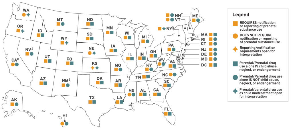 [52]. “Substance Use During Pregnancy and Child Abuse or Neglect: Summary of State Laws,” Legislative Analysis and Public Policy Association, October 2022. https://legislativeanalysis.org/wp-content/uploads/2022/10/Substance-Use-During-Pregnancy-And-Child-Abuse-Or-Neglect-Summary-of-State-Laws.pdf; Lloyd Sieger and Rebbe. https://journals.sagepub.com/doi/full/10.1177/1077559520922313; Alexander D. McCourt et al., “Development and Implementation of State and Federal Child Welfare Laws Related to Drug Use in Pregnancy,” Milbank Quarterly 100:4 (December 2022), pp. 1076-1120. https://pubmed.ncbi.nlm.nih.gov/36510665; Margaret H. Lloyd et al., “Planning for safe care or widening the net?: A review and analysis of 51 states’ CAPTA policies addressing substance-exposed infants,” Children and Youth Services Review 99 (April 2019), pp. 343-354. https://www.sciencedirect.com/science/article/abs/pii/S0190740918309848.